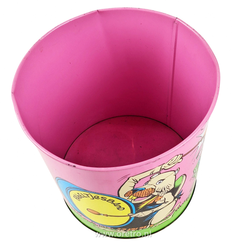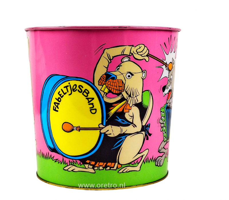 Rond roze blik met de afbeelding van de Fabeltjesband.