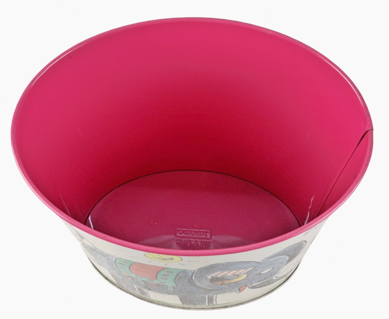 Ovaal roze blik hoogte 26,5 cm, lengte 26,5 cm, breedte 19,5 cm.