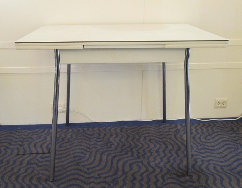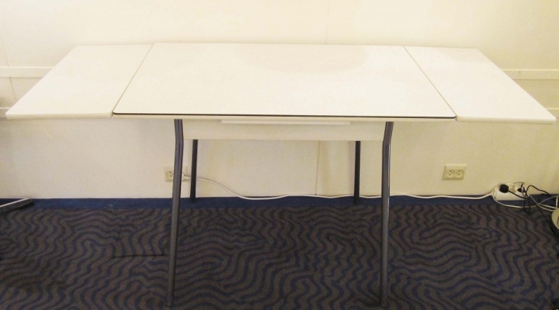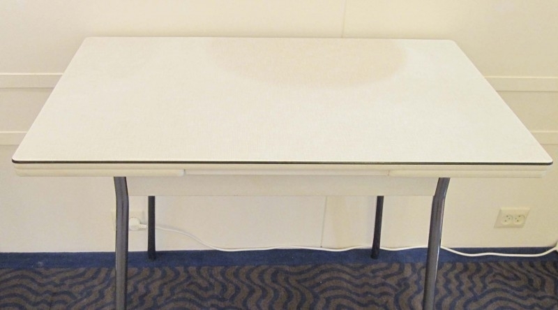 vintage tafel formica wit uittrekbaar. Hoogte 73,5 cm. Breedte 60 cm. Lengte ingeschoven 94 cm. Lengte met beide zijstukken uitgeschoven 152 cm. Het blad is wit met een grijs streepjespatroon.