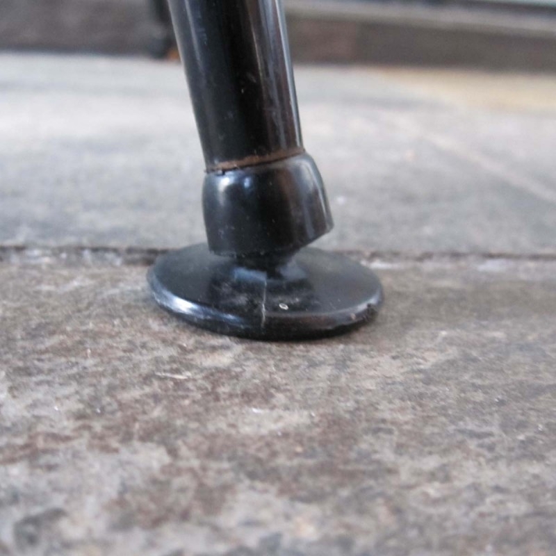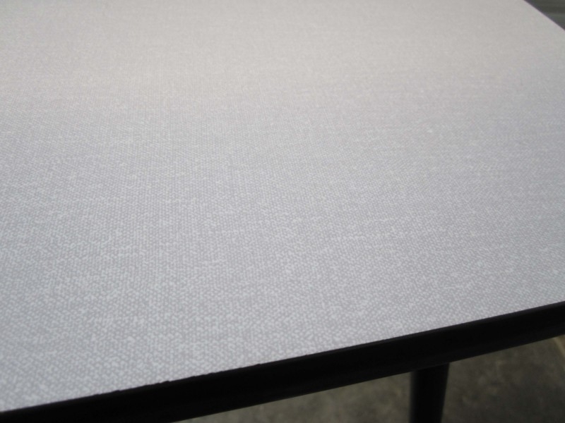 Kleine tafel met wit gemeleerd formicablad. Jaren 50. Zwart ijzeren pootjes met zwenkvoetje. Het blad is niet vierkant naar heeft de typische rondlopende zijkanten. Hoogte 45 cm. Lengte 75 cm, breedte 44,5 cm.