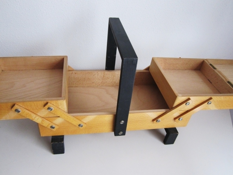 Vintage naaibox of naaidoos van hout. Blank gelakt met matzwart. Lengte 40 cm, breedte 20 cm. Hoogte met hengsel 29 cm. Geheel opengeklapt totale breedte 105 cm.